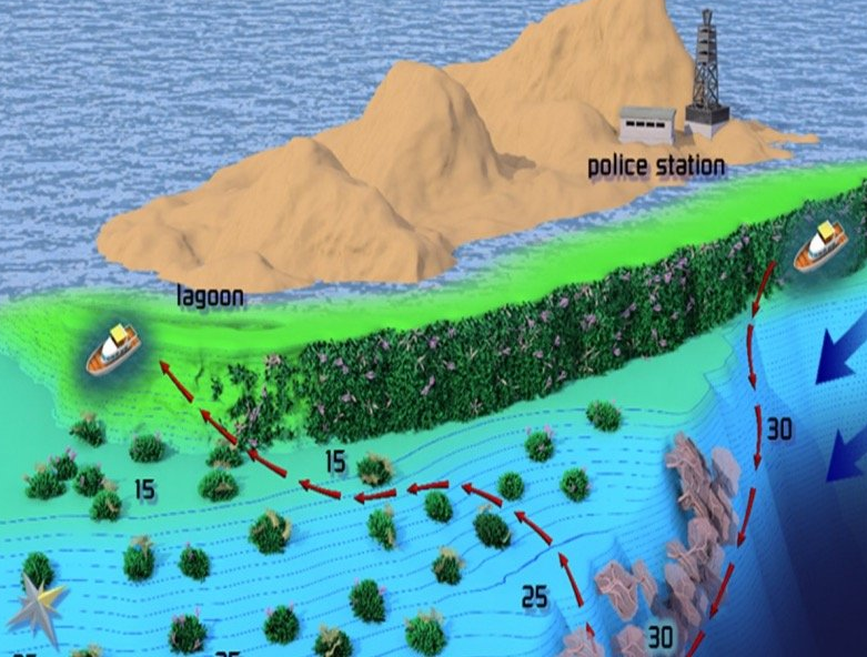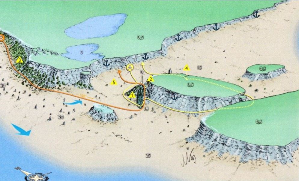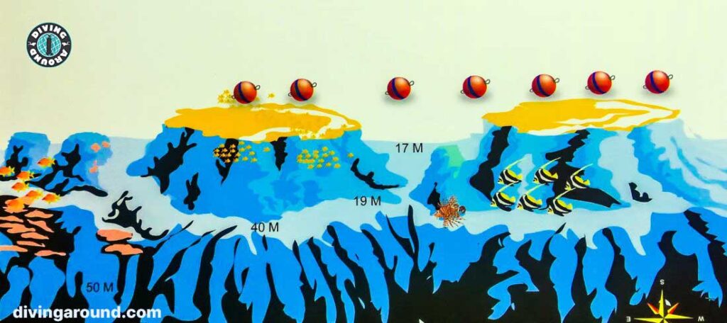 Positioned on a shallower shelf at approximately 14 meters, two substantial underwater coral blocks form a notable feature. This shelf descends rapidly, transitioning into a steep wall that plunges to considerable depths in the north. However, as the top of these blocks is just about 3 meters below the water’s surface, they offer minimal protection from waves and currents. Consequently, diving at this site is feasible only in calm, windless weather conditions.