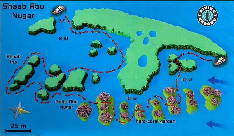 In the vicinity of a large reef shaped like the letter “T,” surrounded by a sandy flat scattered with both larger and smaller coral blocks, several distinct diving sites await exploration. Among them are Shaab Iris, Erg Iris, Gotta Abu Nugar, and Shaab Abu Nugar.