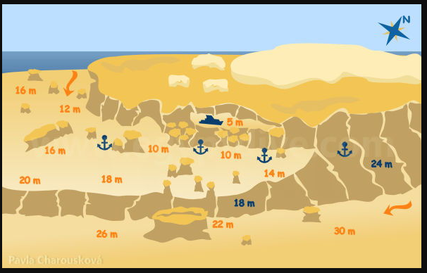 Nestled between the islands of Big and Small Giftun, this reef boasts an open northern side, with the seabed plunging to considerable depths between it and Big Giftun. Divers normally follow the main reef, resembling a banana in shape.