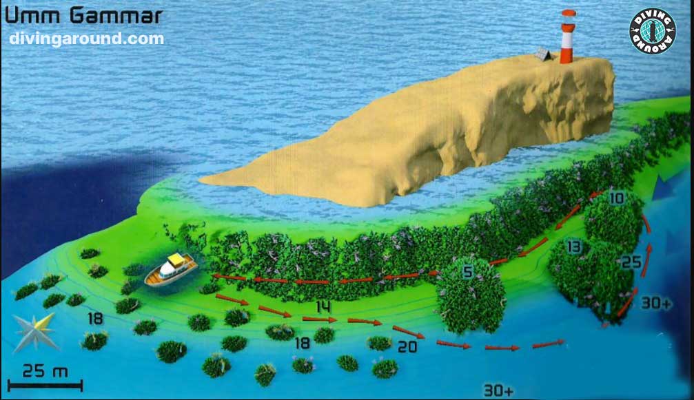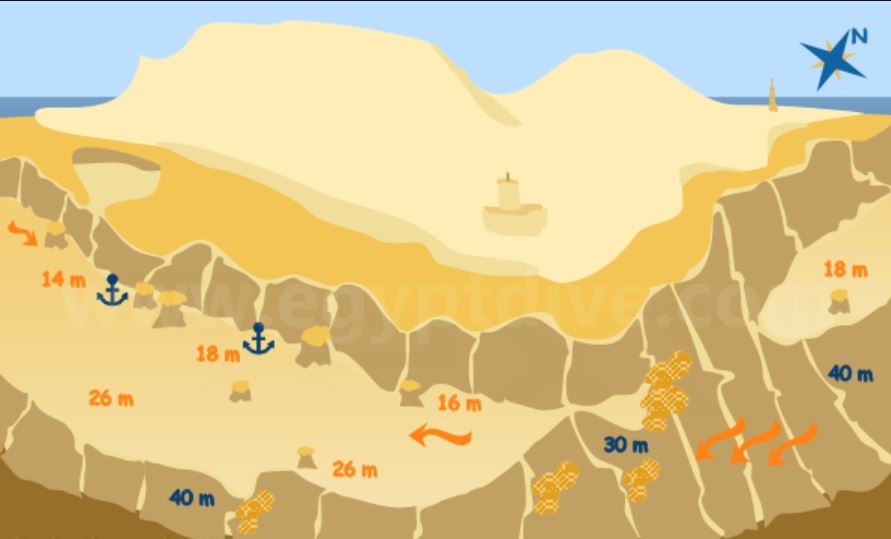 Located in proximity to the island of Umm Gamar, this dive site is often frequented for two dives in a single day. The site features a lengthy reef, and on its western side, divers encounter a plateau. Progressing eastward, the plateau gently slopes from 14 meters to approximately 30 meters before transforming into a steep drop-off or wall. Notably, the remains of an Egyptian army supply ship wreck can be explored in the deeper section.