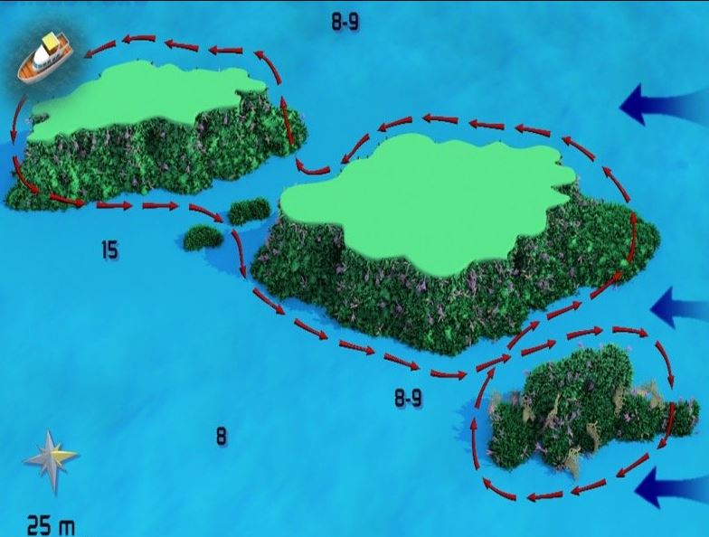 This island offers diverse diving opportunities, but perhaps the most intriguing is the current dive. The drift commences just beyond the police station building on the island, above a deep wall. Divers glide with the current, akin to flying, at an optimal depth ranging between 27-30 meters. Along the way, the journey showcases magnificent gorgonian fans growing from the wall. It’s not uncommon to encounter sizable napoleons, groupers, or tuna actively hunting above the drop-off.