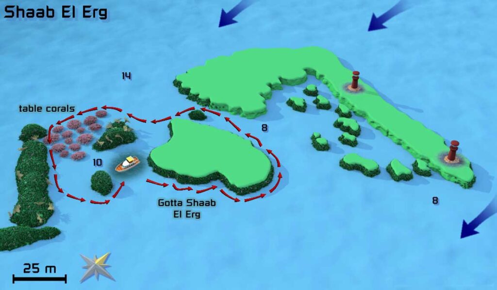 This diving location stands as the furthest spot in the northern direction, nestled between Hurghada and El Gouna. Due to its distance, it is more frequently visited by ships departing from El Gouna. A northbound safari boat is also often anchored here. The reef itself showcases beautiful hard corals, particularly in the channel that runs between the main reef and the smaller Gotta Shaab El Erg. In the northern section, a coral garden and towers adorned with various coral types enhance the underwater scenery.
